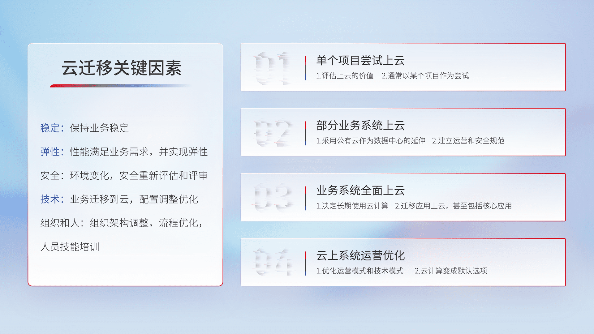 结合实际业务,,,从规划设计、、云平台选型、、、、云原生改造、、、数据迁移、、、集成交付,,迁移全过程为客户识别最佳上云路径,,做好风险识别管理,,,设计网络架构、、、身份权限、、安全审计合规、、、操作审计、、日志审计、、监控告警策略、、、多站点容灾设计等,,对云上基础设施进行整体规划,,,提升IT治理水平,,以满足弹性、、、高可用、、、、高性能的需求。。。。