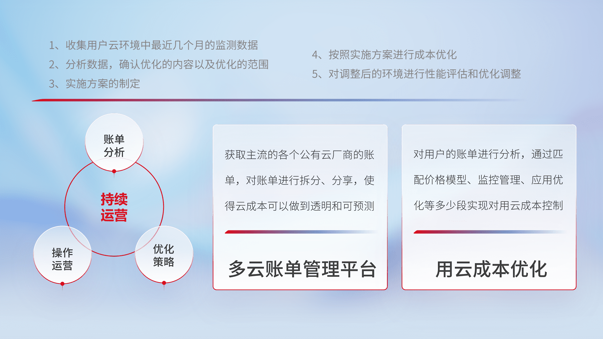 通过多云纳管,,,以统一的资源数据模型把客户的云资源进行抽象和封装,,进而实现对多云资源的统一操作,,,保障云资源管理的可靠性、、稳定性与可用性。。。量身定制化运维内容,,配置、、、、开发运维、、、、补丁管理、、、、备份、、、监控、、、认证和访问管理、、、、审计和日常巡检等,,,,保障在用云过程中的可靠度,,稳定度以及高可用率。。。。